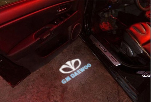 Подсветка с логотипом Daewoo — новый нестандартный вариант тюнинга! В дверь авто устанавливается миниатюрный проектор, который выводит на асфальт цветное изображение логотипа Daewoo. Картинка появляется, когда вы открываете дверь, и исчезает, когда дверь закрывается. Выглядит это очень стильно и необычно.