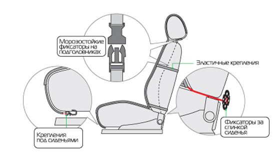 Чехлы универсальные, оснащены эластичными креплениями и надежным фиксатором за спинкой. Накидки подойдут для любых сидений. Данный комплект крепится на резинку с защелкой (на спинке) и с помощью крючков, расположенных на подголовнике и по периметру всей накидки. Через крючки можно протянуть любую резинку и накидка плотно закрепится на сидении.