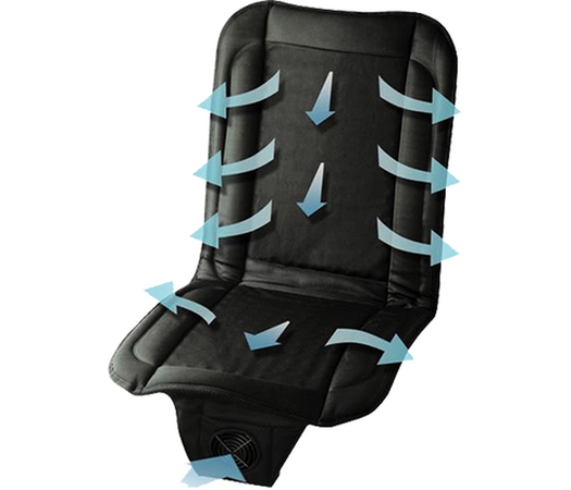И второе - это вентиляция, которая поможет вам легко перенести любую жару. Накидка с охлаждением WAECO воздухопроницаемая, она "дышит" по всей поверхности. При этом воздух подается дозированно, чтобы вы не застудили поясницу и другие части тела. Воздух в накидку поступает от вентилятора, который крепится под сиденьем (это удобно и незаметно). Модель имеет 2 режима охлаждения, переключатель расположен на штекере прикуривателя.