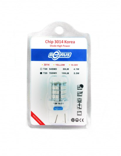 Светодиодная лампа T20 5.5W предназначена для установки в противотуманные фары и указатели поворотов. Она намного ярче обычных галогеновых ламп, отлично освещает дорогу даже в самую непроглядную темноту и сильный ливень. Цвет свечения со временем не изменяется. Служит такая лампа очень долго, при этом потребляет незначительное количество энергии.