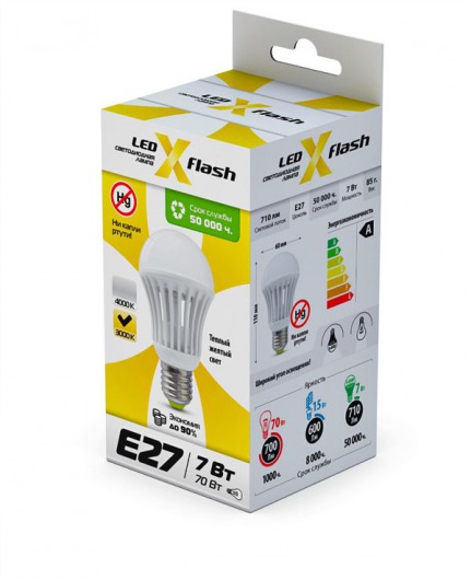 Cветодиодная лампочка X-Flash отличается рекордным сроком службы — 50 тысяч часов (около 20 лет при работе по 8 часов в сутки). Это значит, что X-Flash прослужит вам в 50 раз дольше, чем обычная лампа накаливания и в 6 раз дольше, чем компактная люминесцентная лампа!