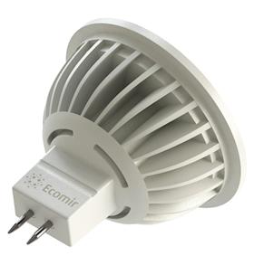 Светодиодная лампа Ecomir GU5.3 4W эквивалентна галогеновой лампе мощностью 30 Вт с цоколем MR16. Потребляемая мощность – всего 4 Вт, цветовая температура – 3000 К (это желтый свет). Световой поток — 300 лм. Напряжение — 220 В. Матовый рассеиватель. Угол освещения > 90°.