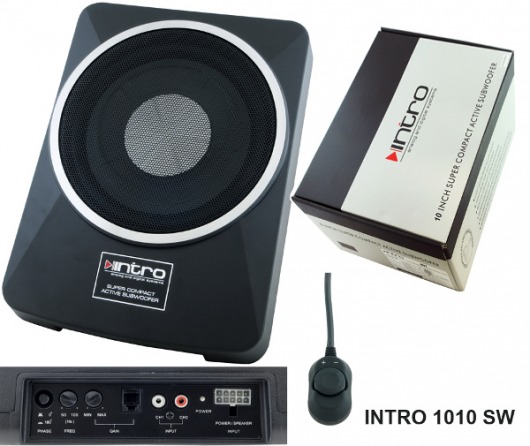 Активный сабвуфер Intro INT-1010SW – это очень компактный усилитель звука с корпусом небольшой высоты и встроенным усилителем мощности. Он занимает совсем немного места в багажнике, а в некоторых автомобилях его можно установить и под водительским или пассажирским сиденьем.