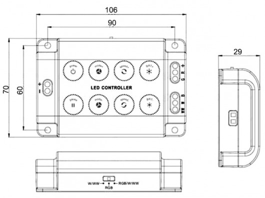 RGB-контроллер RF-SR 8B-5CH с мощностью 240/480W позволит вам управлять свечением светодиодной ленты с помощью пульта ДУ по радио-каналу и прямо на корпусе контроллера. При этом дальность действия достигает 50 метров!