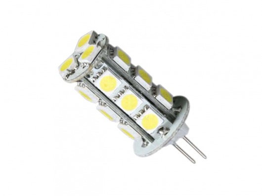 Светодиодная лампа G4/18-5050 с 18 светодиодами SMD 5050 и напряжением 10-30V это отличная альтернатива галогенным лампам и лампам накаливания с цоколем G4. Яркость данной лампы составляет 12-15 Лм на 1 диод. А потребляемая мощность — всего 4,3 Вт! Цвет свечения лампы — холодный белый.