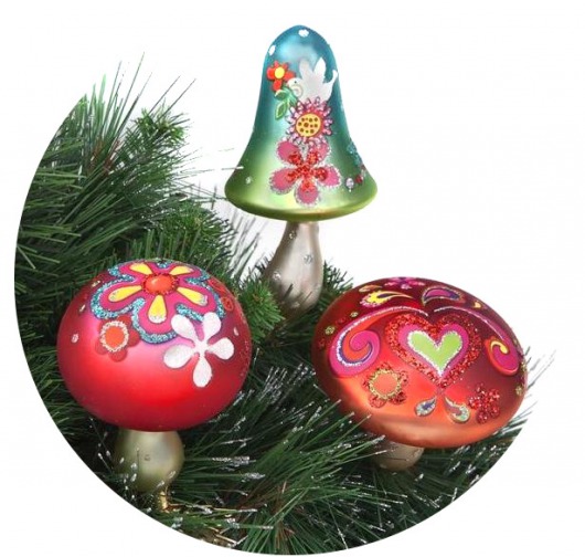 Волшебные грибы из стекла имеют просто фантастический вид, они сделаны из стекла и сказочно разукрашены. Размеры стеклянных грибов - 9х11,5 см. Для удобства они поставляются со специальной прищепкой, которой вы сможете легко и надежно прикрепить игрушки на елку.
