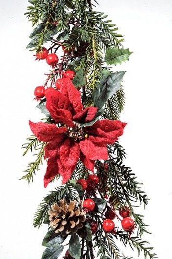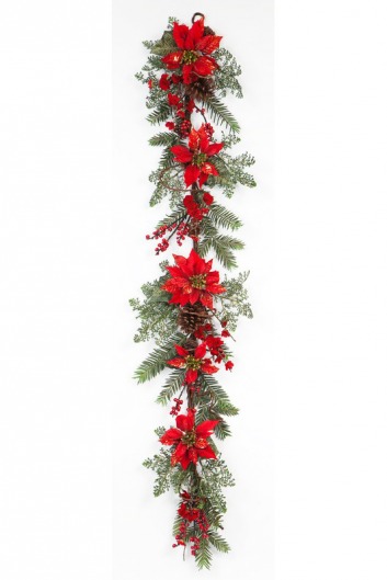 Гирлянда еловая с красными пуансеттиями, цветами, ягодами и шишками (1,52 м)