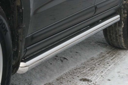 Пороги на Hyundai Santa Fe – это боковые подножки из нержавеющей стали диаметром 76 мм, которые позволяют более комфортно входить и выходить из салона автомобиля. Подножки Hyundai Santa Fe очень прочные, надежные и долговечные: они не боятся коррозии, сколов и царапин и выдерживают большие нагрузки.