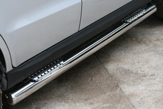 Пороги на Hyundai Santa Fe – это боковые подножки из нержавеющей стали диаметром 76 мм, которые позволяют более комфортно входить и выходить из салона автомобиля. Подножки Hyundai Santa Fe очень прочные, надежные и долговечные: они не боятся коррозии, сколов и царапин и выдерживают большие нагрузки.