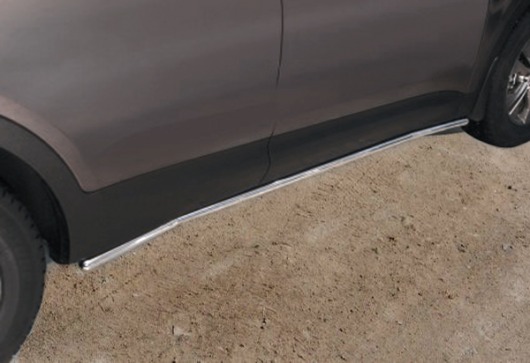 Пороги на Hyundai Santa Fe – это боковые подножки из нержавеющей стали диаметром 42 мм, которые позволяют более комфортно входить и выходить из салона автомобиля. Подножки Hyundai Santa Fe очень прочные, надежные и долговечные: они не боятся коррозии, сколов и царапин и выдерживают большие нагрузки.