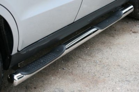 Пороги на Hyundai Santa Fe – это боковые подножки из нержавеющей стали диаметром 76 мм, которые позволяют более комфортно входить и выходить из салона автомобиля. Подножки Hyundai Santa Fe очень прочные, надежные и долговечные: они не боятся коррозии, сколов и царапин и выдерживают большие нагрузки.