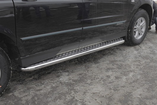 Пороги на SsangYong Actyon Sport – это боковые подножки из нержавеющей стали диаметром 60 мм, которые позволяют более комфортно входить и выходить из салона автомобиля. Подножки SsangYong Actyon Sport очень прочные, надежные и долговечные: они не боятся коррозии, сколов и царапин и выдерживают большие нагрузки.