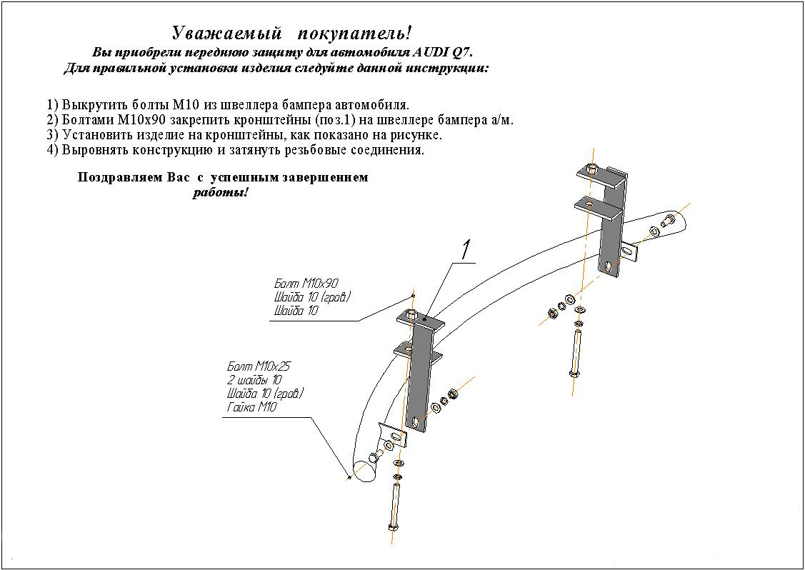 Защита переднего бампера труба предназначена для автомобилей Audi Q7. Вам не придется подгонять защиту под размеры бампера вашего авто. И с монтажом проблем не возникнет: установка защиты переднего бампера производится в штатные отверстия, а значит, необходимость сверлить кузов отпадает.