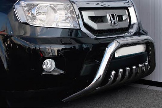 Дуга на передний бампер с нижней защитой (акула) предназначена для автомобилей Honda Pilot от 2008 г.в. Вам не придется подгонять передний кенгурятник под размеры кузова вашего авто. И с монтажом проблем не возникнет: установка кенгурятника Honda Pilot производится в штатные отверстия, а значит, необходимость сверлить кузов отпадает.