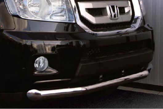 Труба на бампер Honda Pilot защищает передний бампер автомобиля от различных механических повреждений при мелких ДТП и неудачных парковках, а также незаменима при езде по бездорожью. А кроме этого, труба на передний бампер Хонда Пилот смотрится очень стильно и эффектно.