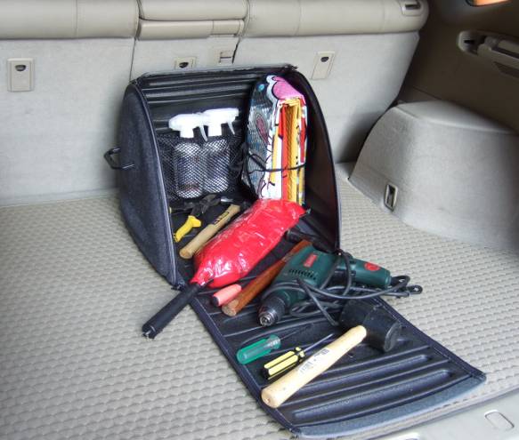 Органайзер для автомобиля удобно раскладывается. Поэтому Вы можете сразу найти нужную вещь. Внутри на вертикальной стенке сумки есть сетчатый карман, где Вы можете хранить всякие мелочи. На дне складного органайзера есть ремни, которые позволяют надежно закрепить инструменты. Более того, он удобно крепится к текстильной поверхности пола на липучке. Это убережет Ваши вещи от разбрасывания, и в Вашем багажнике всегда будет идеальный порядок.