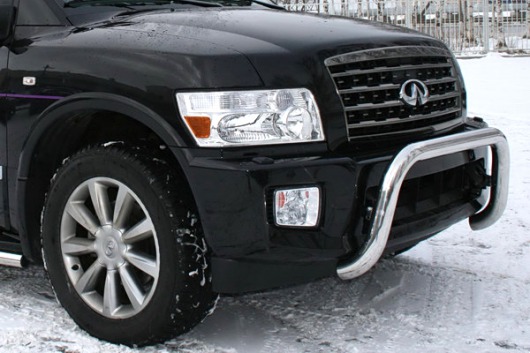 Передняя решетка Infiniti QX56 (кенгурятник) – это защитная дуга на бампер из нержавеющей стали диаметром 76 мм.