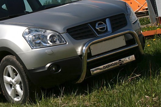 Защитная решетка переднего бампера предназначена для автомобилей Nissan Qashqai от 2007 г.в. Вам не придется подгонять передний кенгурятник под размеры кузова вашего авто. И с монтажом проблем не возникнет: установка кенгурятника Nissan Qashqai производится в штатные отверстия, а значит, необходимость сверлить кузов отпадает.