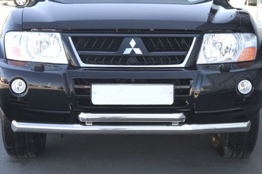 Защита переднего бампера для Mitsubishi Pajero III – это двойная труба на бампер из нержавеющей стали диаметром 76/60 мм.