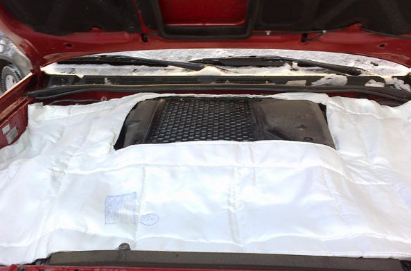 Автоодеяло весит всего несколько килограммов и устанавливается легко и просто. Правильно подобранное, оно стелится любой стороной на мотор, ничем не закрепляется и полностью закрывает моторный отсек. При необходимости вы сможете подвернуть края утеплителя. Материал имеет высокую плотность, так что вы можете быть уверены в том, что одеяло не намотается на подвижные части двигателя.