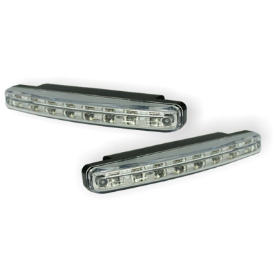 В комплект огней дневного света 008-2 входят 2 секции по 8 светодиодов с рабочим напряжением 12В. Благодаря универсальному креплению их можно установить на любой автомобиль.