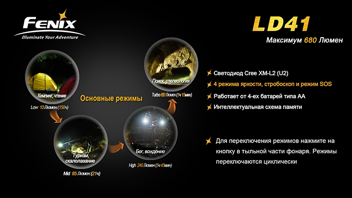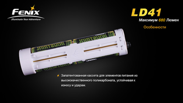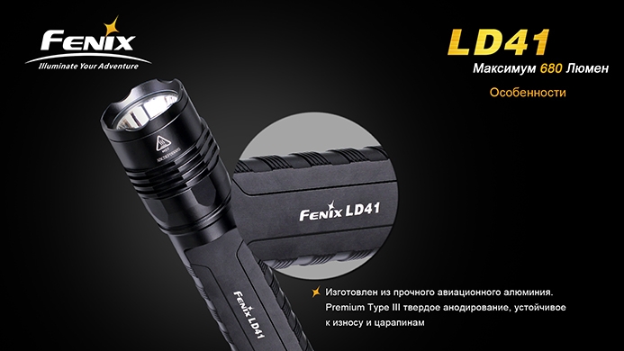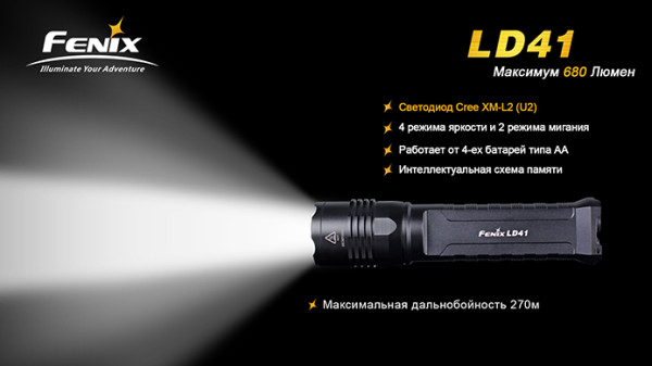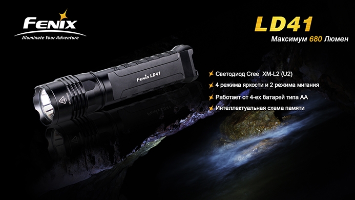 Фонарь Fenix LD41 с диодом Cree XM-L U2 — это обновлённая версия более раннего Fenix LD41 XM-L. Модель отличается повышенной яркостью (680 люмен против 520 люмен у предшественника). Очень надёжный, компактный и мощный фонарик идеально подойдёт для туристов, спелеологов, поисковиков и любителей прочего экстремального отдыха.