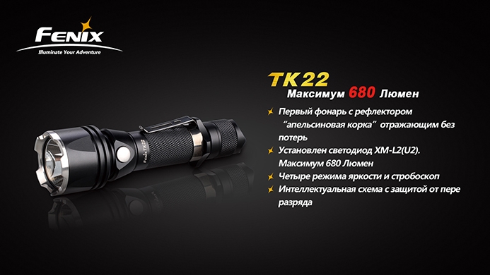 Тактический фонарь Fenix ТК22 — новинка от крупнейшего производителя фонарей, компании Fenix. Этот тактический фонарик — первая модель с текстурированным отражателем типа «апельсиновая корка», предотвращающим потерю светового потока. Всего от одного аккумулятора 18650 этот компактный фонарь даёт очень мощный световой луч.