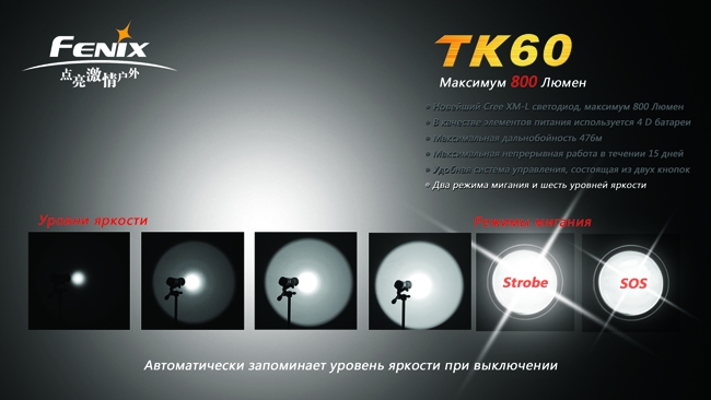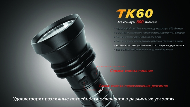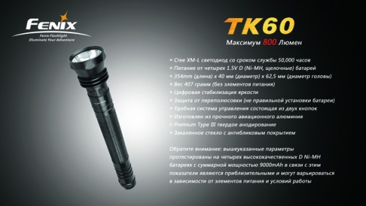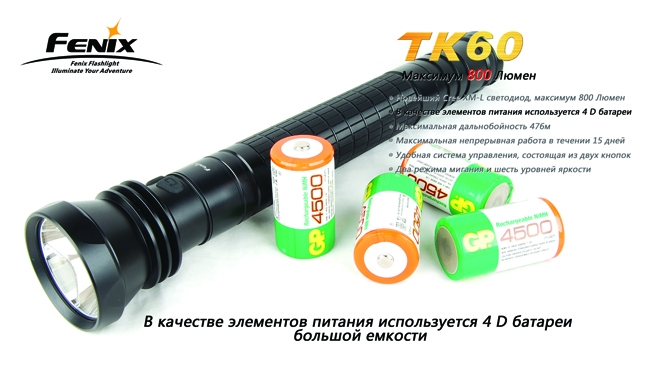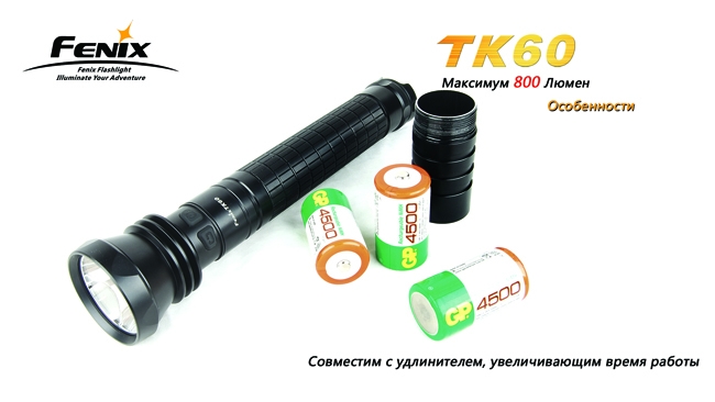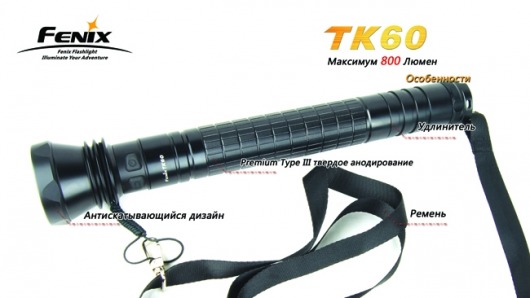 Поисковый фонарь TK60 CreeXM-L — одна из лучших моделей от производителя Fenix. При отличных характеристиках мощности, надёжности и прочности фонарь в первую очередь выделяется исключительно продолжительным временем работы — на одном заряде аккумуляторов фонарь проработает почти 15 суток! В сочетании с прочими достоинствами это делает Fenix TK60 хитом продаж.