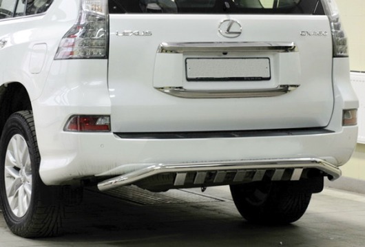 Защита заднего бампера труба с декоративными элементами предназначена для автомобилей Lexus GX460 от 2013 г.в. Вам не придется подгонять защиту под размеры бампера вашего авто. И с монтажом проблем не возникнет: установка защиты заднего бампера производится в штатные отверстия, а значит, необходимость сверлить кузов отпадает.