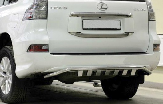 Защита заднего бампера труба с декоративными элементами предназначена для автомобилей Lexus GX460 от 2013 г.в. Вам не придется подгонять защиту под размеры бампера вашего авто. И с монтажом проблем не возникнет: установка защиты заднего бампера производится в штатные отверстия, а значит, необходимость сверлить кузов отпадает.