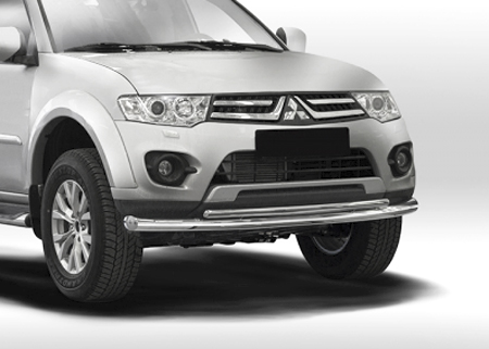Защита переднего бампера для Mitsubishi Pajero Sport – это двойная труба на бампер из нержавеющей стали диаметром 76/42 мм.