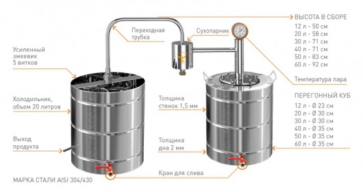 С помощью этого самогонного аппарата большой вместимости с сухопарником и баком на 90 литров вы легко сможете приготовить качественные спиртные напитки в любых условиях, например, на даче или в деревне. Этот аппарат не обязательно подключать к водопроводу: для охлаждения змеевика в нем предусмотрен дополнительный резервуар, который заполняется холодной водой. При этом вам не придется осваивать сложные технологии самогоноварения: достаточно просто залить в бак брагу и поставить аппарат на плиту (подойдет как газовая, так и электрическая плита) или на костер (почему бы и нет?).