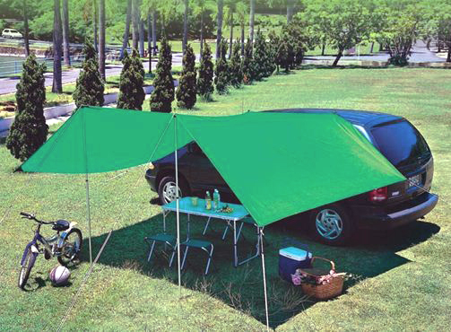 • Одна часть натяжного тента надежно крепится к крыше авто при помощи специальных вакуумных присосок. Другая часть навеса фиксируется на земле стойками и растяжками.