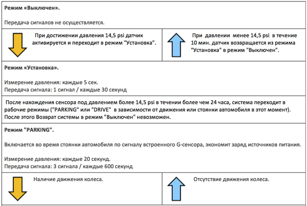 Датчик постоянно передает показатели давления и температуры на небольшой дисплей, который вы устанавливаете в любое удобное место в салоне автомобиля. Дисплей отображает данные в виде четырех цифр, которые располагаются соответственно колесам. Когда давление и температура одного из колес выходят за установленные вами пределы, система предупреждает вас звуковым и цветовым сигналами.
