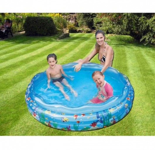 Детский бассейн "Аквариум" состоит из 3-х колец,  имеет прозрачные стенки с красочным рисунком в виде забавных рыбок и водорослей. Такой дизайн привлекает внимание и поднимает настроение. Диаметр надувного бассейна (1.63 метра) позволяет находиться внутри как ребенку, так и взрослому.