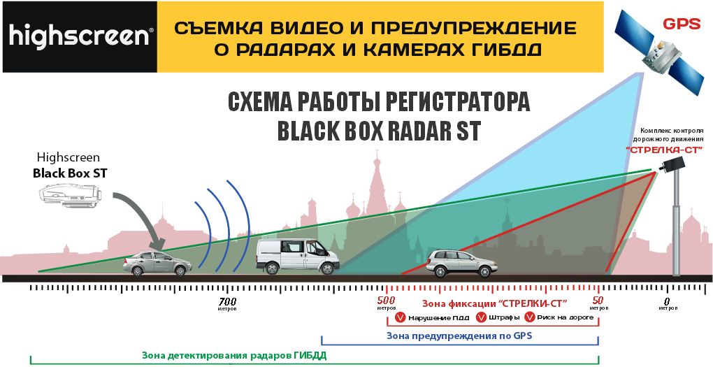 Видеорегистратор со встроенным радар-детектором Highscreen Black Box ST не только подсказывает вам, где находятся радары, камеры и посты ДПС, но и снимает все, что происходит на дороге. А это значит, что вы получаете 2 устройства в 1! И автомобильный видеорегистратор со съемкой в Full HD качестве с разрешением 1920x1080, ЖК-монитором 2 дюйма, G-сенсором, датчиком движения, и радар-детектор с GPS модулем, который прекрасно распознает все российские фиксаторы скорости. Радар-детектор работает в диапазонах X, K, Ka, Ku и фиксирует сигналы новейшего радарного комплекса ГИБДД «Стрелка-СТ» с расстояния 500-700 метров.
