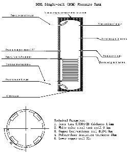 Внешний бак - из крашеной стали толщиной 0,4 мм. Максимальное давление - 6 МПа. Нижний теплообменник в длину - 30 метров. Что касается медной спирали, то диаметр ее - 12 мм, толщина - 1 мм. Теплоизоляция обеспечивается полиуретановой пеной толщиной 50 мм. Гарантия бак-аккумулятор 300L - 5 лет, послегарантийное обслуживание.