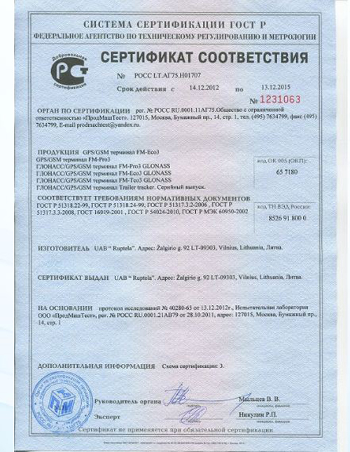 Устройство полностью соответствует приказу Минтранса РФ № 285 "Об утверждении требований к средствам навигации, функционирующим с использованием навигационных сигналов системы ГЛОНАСС или ГЛОНАСС/GPS и предназначенным для обязательного оснащения транспортных средств категории М, используемых для коммерческих перевозок пассажиров, и категории N, используемых для перевозки опасных грузов".
