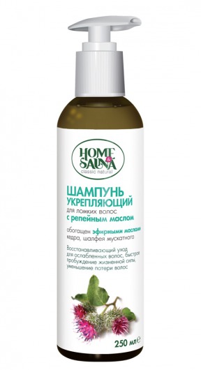 Шампунь с репейным маслом укрепляет корни, уменьшает ломкость волос, не содержит красителей и придает волосам пышность, блеск и эластичность. Касторовое масло в составе шампуня укрепляет волосы, восстанавливает их структуру, оказывает благотворное действие на волосяные луковицы и предотвращает выпадение волос.