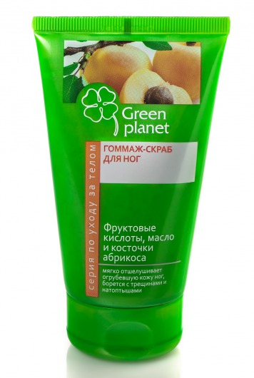 Гоммаж-скраб для ног Зеленая планета содержит фруктовые кислоты и масло косточки абрикоса. Средство мягко отшелушивает и удаляет отмершие клетки кожи, смягчает огрубевшие участки на ступнях, способствует обновлению кожи, борется с трещинами и натоптышами, питает и ухаживает, делает кожу стоп гладкой и нежной. Подходит для ухода за очень сухой кожей на коленях и локтях, за кожей стоп. Подходит для регулярного применения.
