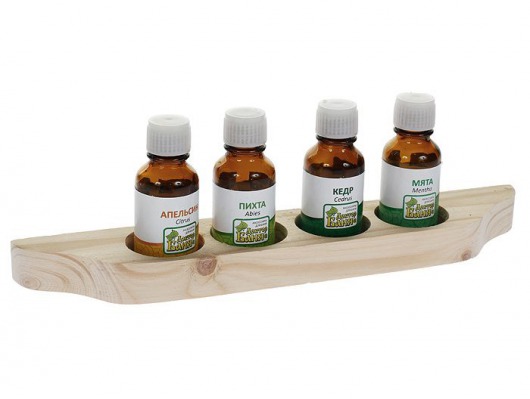 Набор аромамасел Доктор Баня на деревянной полочке-подставке станет отличным подарком для тех, кто увлекается ароматерапией и любит ходить в баню. В набор входит 4 флакона с эфирными маслами по 15 мл: