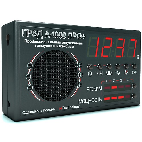 Универсальный отпугиватель грызунов и кротов ГРАД А-1000 ПРО+ — это усовершенствованная модель А-1000 ПРО и не имеет аналогов в мире! Помимо всех выполняемых функций, сохранившихся от А-1000 ПРО, устройство оснащено часами и таймером для работы прибора в автоматическом режиме. Данная модель способна защитить огромную площадь — до 1000 м2 от любых вредителей, поддерживает бесшумный режим и регулировку мощности излучения. Воздействие на грызунов происходит 3-мя способами: звук, вспышки светодиодного стробоскопа и ультразвук. Особый изменяющийся "рисунок" звукового сигнала не дает грызунам адаптироваться к работе устройства.