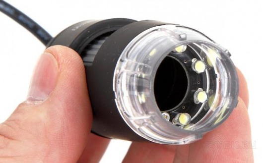 В корпусе вокруг объектива установлены 8 ярких светодиодов с белым свечением. Подсветка предназначена для традиционного наблюдения непрозрачных предметов (в падающем свете). Светодиоды отличаются низким энергопотреблением и качественным светом, питаются от компьютера через USB-порт и не требуют дополнительного питания.