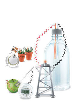 Как это работает? Природное электричество вырабатывается путем погружения пары (или пар) соединенных цинковых и медных пластин в водную среду, например, в картофель, грязь, лужу или фрукт. Цинковая пластина — отрицательно заряженный электрод; медная пластина — положительно заряженный электрод. Когда металлы погружаются в электролит, происходит химическая реакция. Кислота электролита нарушает атомарную структуру меди и цинка, в результате чего отдельные электроны освобождаются. В этом химическом процесс цинк — более реакционно способный металл по сравнению с медью. В этом химическом процессе цинк поставляет больше электронов, чем медь. Избыточные электроны направляются от цинковой пластины к медной. Поток электронов от более реакционно способного металла к менее реакционно способному создает электрический ток, достаточный для работы маленькой лампочки, небольших часов или звукового чипа.