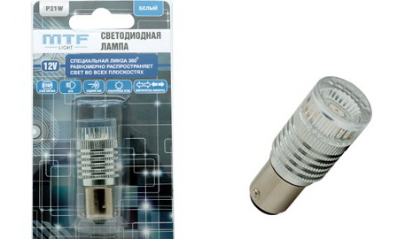 Светодиодная лампа MTF P21W оснащена специальной линзой 360°. Благодаря этому свет распространяется равномерно и полностью освещает площадь отражателя,  расположенную у основания лампы