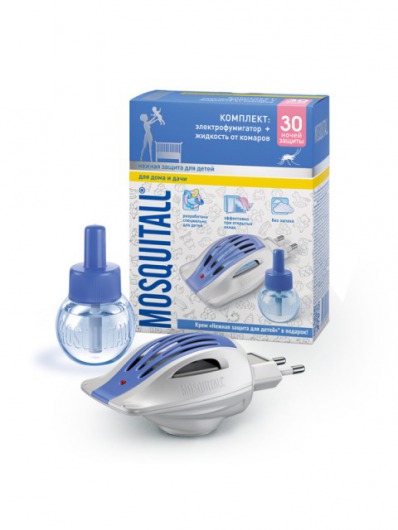В комплект MOSQUITALL "Нежная защита для детей. Для дома и дачи" входят универсальный электрофумигатор и жидкость с инсектицидом, рассчитанная на 30 ночей защиты вашего ребенка от комаров. Вне зависимости от того, будь то городская квартира или загородный дом, фумигатор гарантированно уничтожает всех комаров внутри помещения площадью в 15 квадратных метров уже через 20-30 минут даже при открытых окнах! Можете быть уверенными, что с включенным фумигатором на протяжении всей ночи ни один комар не потревожит сон вашего малыша. И кроме того, никаких посторонних запахов!