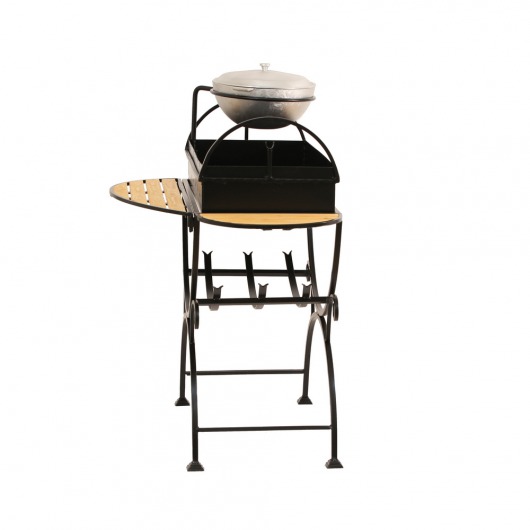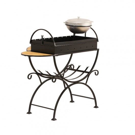 И это не единственные преимущества дачного кованого мангала МСК. Несмотря на изящность и компактность, его конструкция отличается особой прочностью. Стойка усилена элементами ручной ковки, а ящик мангала изготовлен из цельного листа жаростойкой стали толщиной 2 мм на гидравлическом прессе. Такая жаровня выдерживает высокие температурные нагрузки в течение долгого времени и не деформируется. А спереди и сбоку жаровни расположились 2 удобных деревянных столика (один из них съемный), которые можно использовать как подставки для посуды или вместо разделочных досок. В комплекте с мангалом вы также получите казан на 5 литров. В нем можно готовить плов или разогревать уже готовый шашлык.