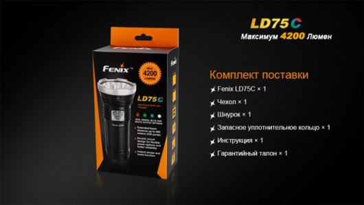 Фонарь Fenix LD75C производители снабдили четырьмя мощными светодиодами Cree XM-L2 U2, каждый из которых располагает запасом работоспособности в 50 000 ч. Яркость этих диодов в максимальном режиме составляет 4000 Люмен. В дополнение к ним можно включить пятый мультицветный диод, который в режиме белого света добавит еще 200 Люмен яркости. Этот диод может работать в режиме красного света с яркостью 140 Люмен, обеспечивая условия для сохранения ночного зрения. В режиме зеленого света возможна яркость 190 Люмен, а в режиме синего — 45 Люмен. Регулировка яркости обычного белого света, а также переключение других режимов работы осуществляется при помощи трех кнопок управления, которые размещены в головной части корпуса фонаря.
