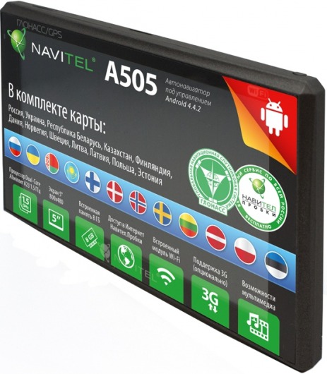 Автомобильный GPS навигатор Navitel A505 проложит оптимальный маршрут, заранее предупредит о поворотах, пробках или о зонах контроля скорости! Навигатор Navitel поддерживает систему ГЛОНАСС. Главное, что дает использование в навигаторе совместного сигнала GPS и ГЛОНАСС — это точность и надёжность. Ведь чем большее количество сигналов от спутников примет ваш навигатор, тем точнее будет определено ваше местоположение и меньше шансов потерять навигацию. Автомобильный навигатор поддерживает навигационное программное обеспечение Навител 9.3 и предустановленные карты России, Украины, Республики Беларусь, Казахстана, Финляндии, Дании, Норвегии, Швеции, Литвы, Латвии, Польши и Эстонии. Вам достаточно только указать конечный пункт!
