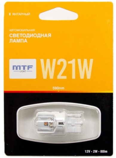 Светодиодная лампа MTF Light W21W 2W с уникальной конструкцией линзы отлично повторяет распространение света штатной лампы. Цвет свечения автолампы: желтый.